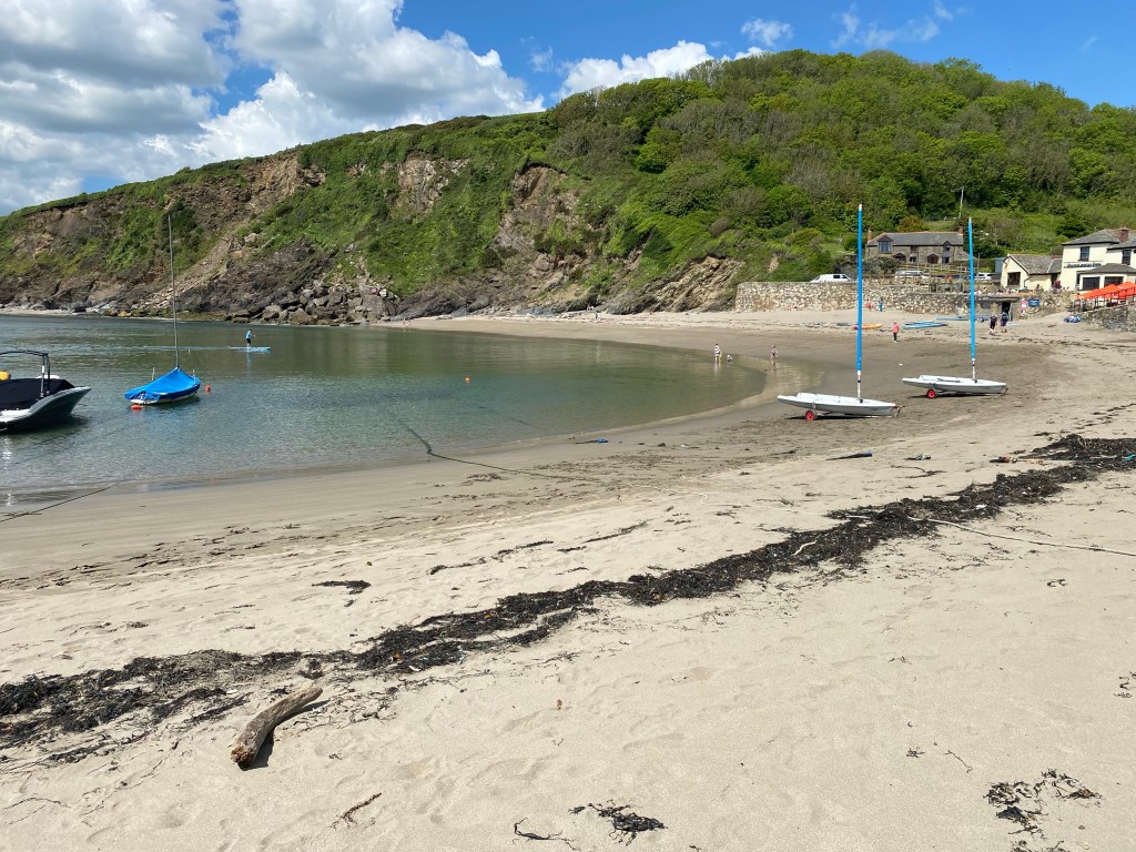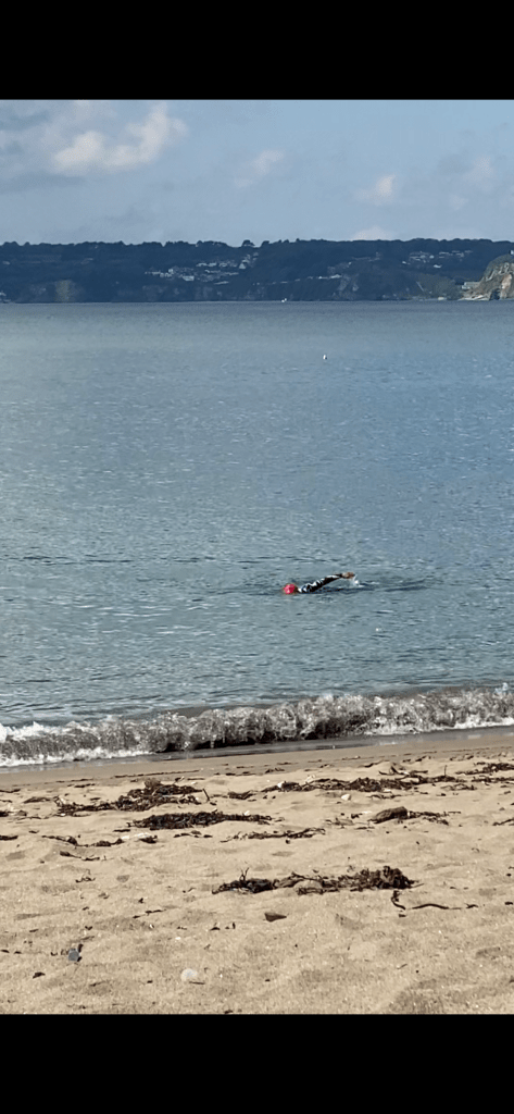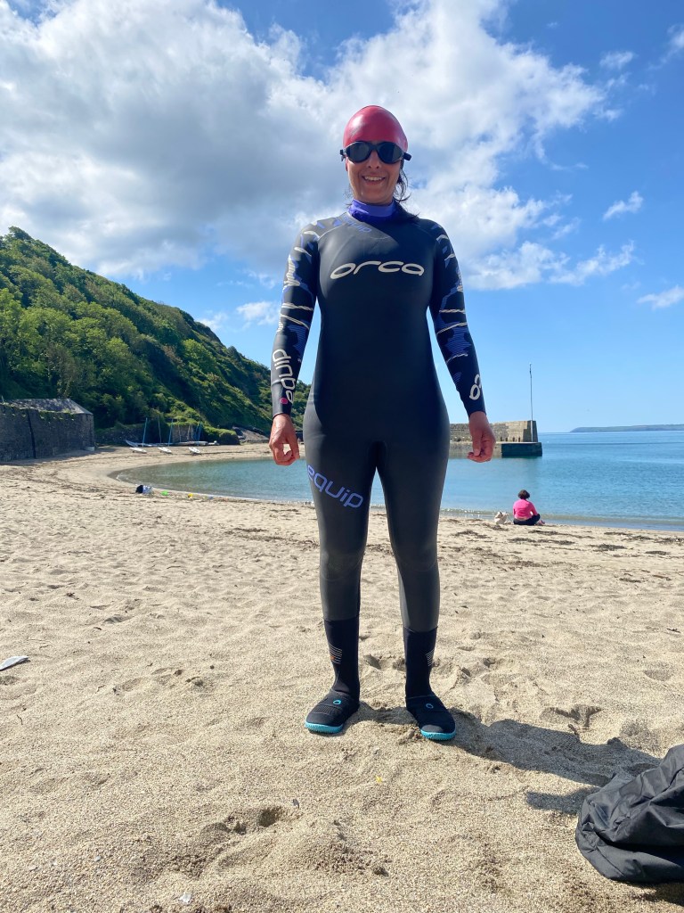 As we were enjoying breakfast too much, our morning meeting took place while we were showering and getting dressed. It appeared that Nisha had done some quick research and found a beach called Polkerris. Nice, secluded and a good place to swim. The car was already packed from yesterday so we grabbed our essentials and off we set. Default sat nav is now google…main roads only 🤣🤣🤣 so of course we got stuck in traffic but that was due to a rta…our journey was only 25 minutes, and again, the car park was down a single track yet busy road. Nisha was adamant that she wanted to swim so we unloaded the car, she carried 3 bags (fist bag had her wetsuit and accessories , second bag her swimsuit and the last bag had her dry robe) and I had our rucksack. What’s the saying…all the gear yet no idea 🤣🤣🤣😜😜😜. We found a nice area on the beach and Nisha started the long process to get ready…the final product: