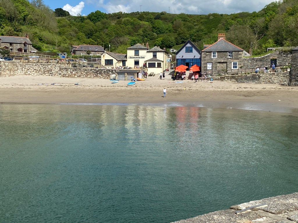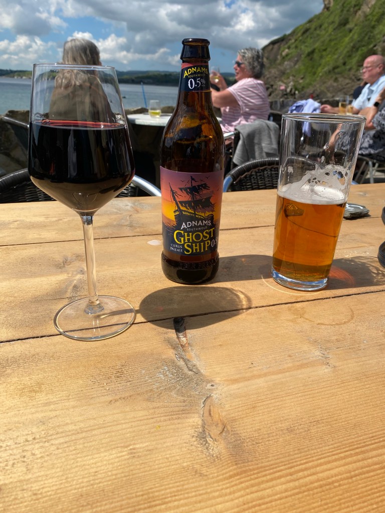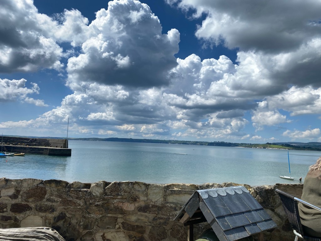 Eventually, Nisha got changed back into normal clothes 😜😜🤣🤣 and we returned ALL of the bags to the car, and went back to the beach to find food and drink. The hut only served tea, coffee and cakes, the pizza place didn’t look too just so we opted for the local pub, found an empty table on the terrace and ordered. We shared a Cornish cheese and pickle sandwich with chunky chips and two coffees. No photos of the food but this is was our view…