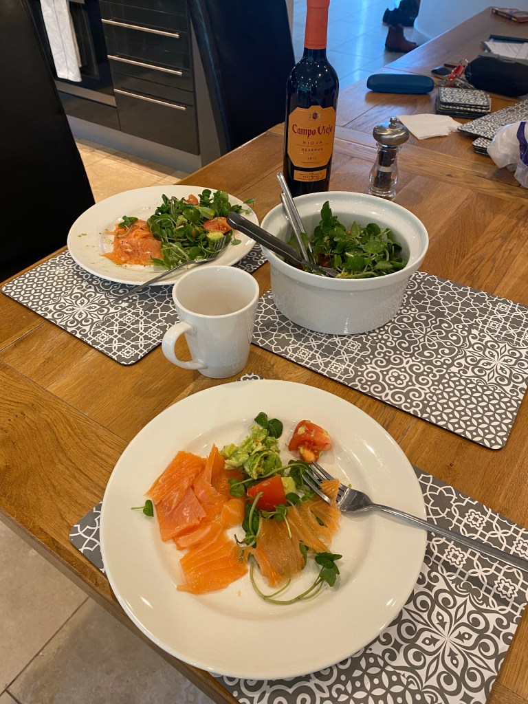 Sooo many choices for dinner…something light was needed, Nisha whipped up a quick smoked salmon salad, accompanied with red wine…